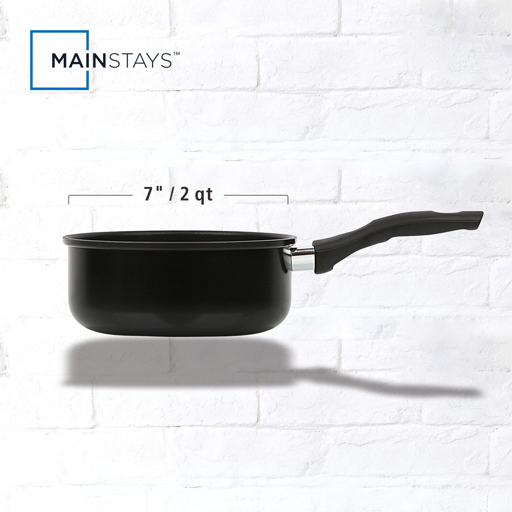 Mainstays basic aluminum nonstick 2qt saucepan 18cm black.Ideal for everyday multi-use at home, the saucepan heats quickly and evenly with its aluminum body.Its interior is coated with 2 layers of non-stick coating which makes it easy cook and easy clean-up. Riveted handle for strong connection. Its cool touch handle make it easy and comfortable handling. And it's dishwasher safe. Suitable for all cooktops except induction.