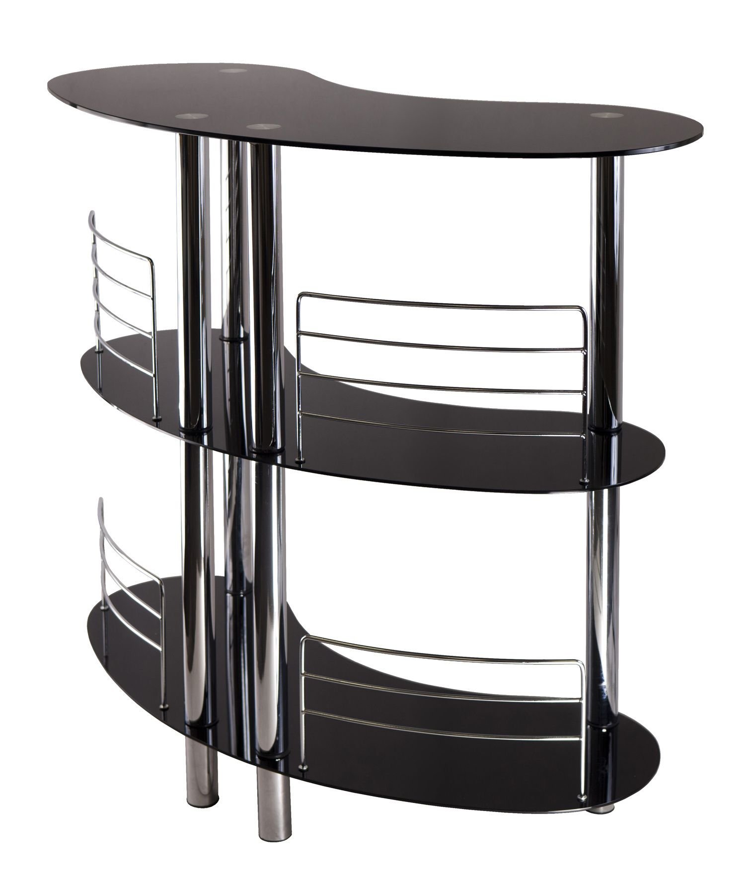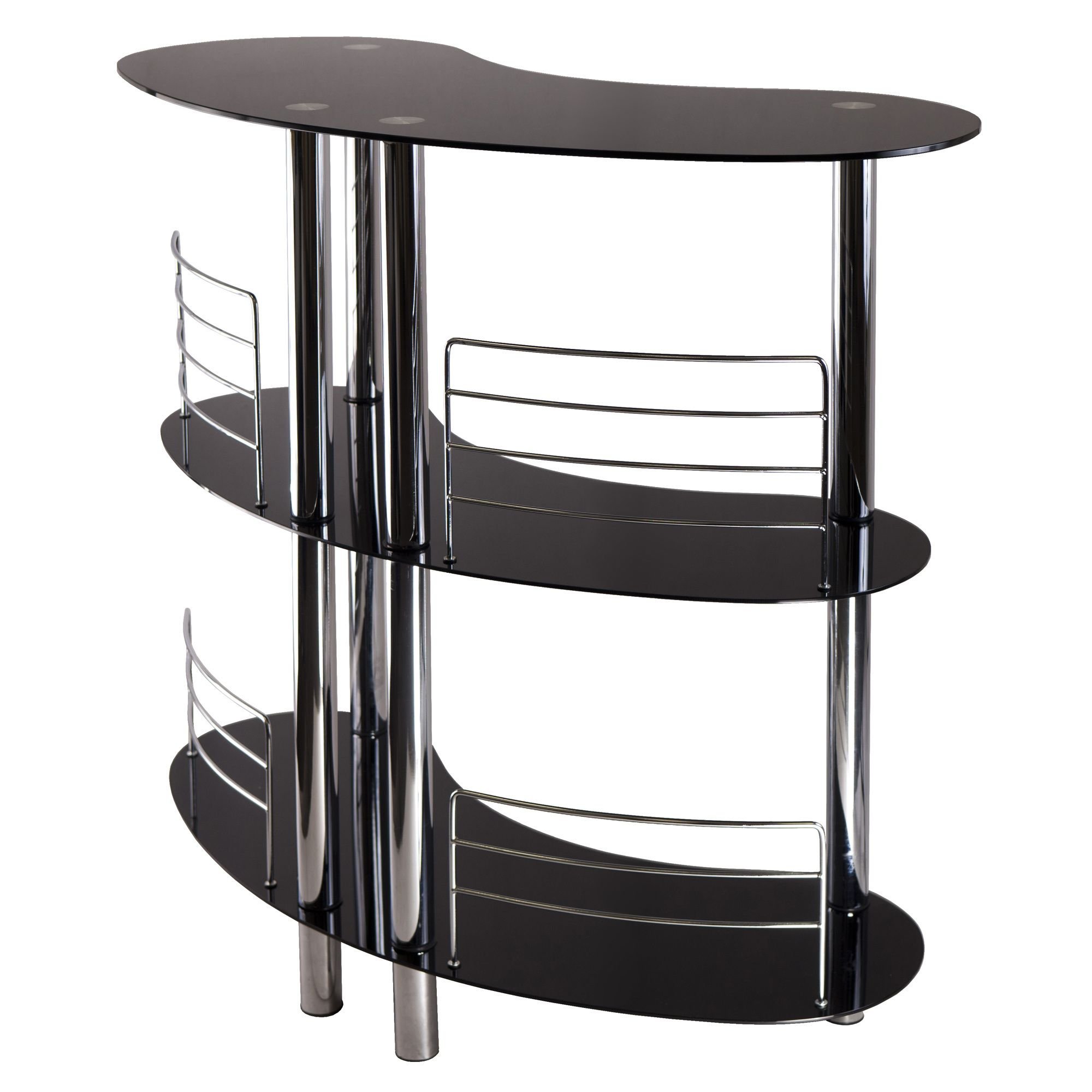 Create an instant bar counter with Martini Entertainment Unit. Elegant and functional with Tempered Glass top and shelves; Chrome Plate Steel Metal Accent. The curved shape provides excellent serving spot and uniqueness to the unit. Overall size : 47"W x 22.6"D x 41.8"H. Bottom Shelf Clearance is 17.9" and 18.25 for middle shelf. Metal Rail Height is 8.24" an 9.61". Assembly RequiredOverall size is 47" W x 22.6" D x 41.8"H. Shelf Clearance for Bottom is 17.9"; Middle is 18.25".Metal Rail Height is 8.24" an 9.61". Posts is Chrome Bright Metal great accent to Black Glass.Static Weight 20 Lbs per Shelf. Assembly Required.nullnullnull This product meets the oversized requirement per UPS/FedEx. The shipping weight reflected is the dimensional weight. This product also meets the large package requirement per UPS/FedEx. The estimated shipping cost will include this fee. Large package is $70.00; applied when length plus girth [(2 x width) + (2 x height)] combined exceeds 130 inches. Additional Handling charge of $10.50 applied where a package's longest side exceeds 48 inches in length; the second longest side exceeds 30 inches in length; or total weight is greater than 70 lbs.This product meets the oversized requirement per UPS/FedEx. The shipping weight reflected is the dimensional weight. This product also meets the large package requirement per UPS/FedEx. The estimated shipping cost will include this fee. Large package is $70.00; applied when length plus girth [(2 x width) + (2 x height)] combined exceeds 130 inches. Additional Handling charge of $10.50 applied where a package's longest side exceeds 48 inches in length; the second longest side exceeds 30 inches in length; or total weight is greater than 70 lbs.