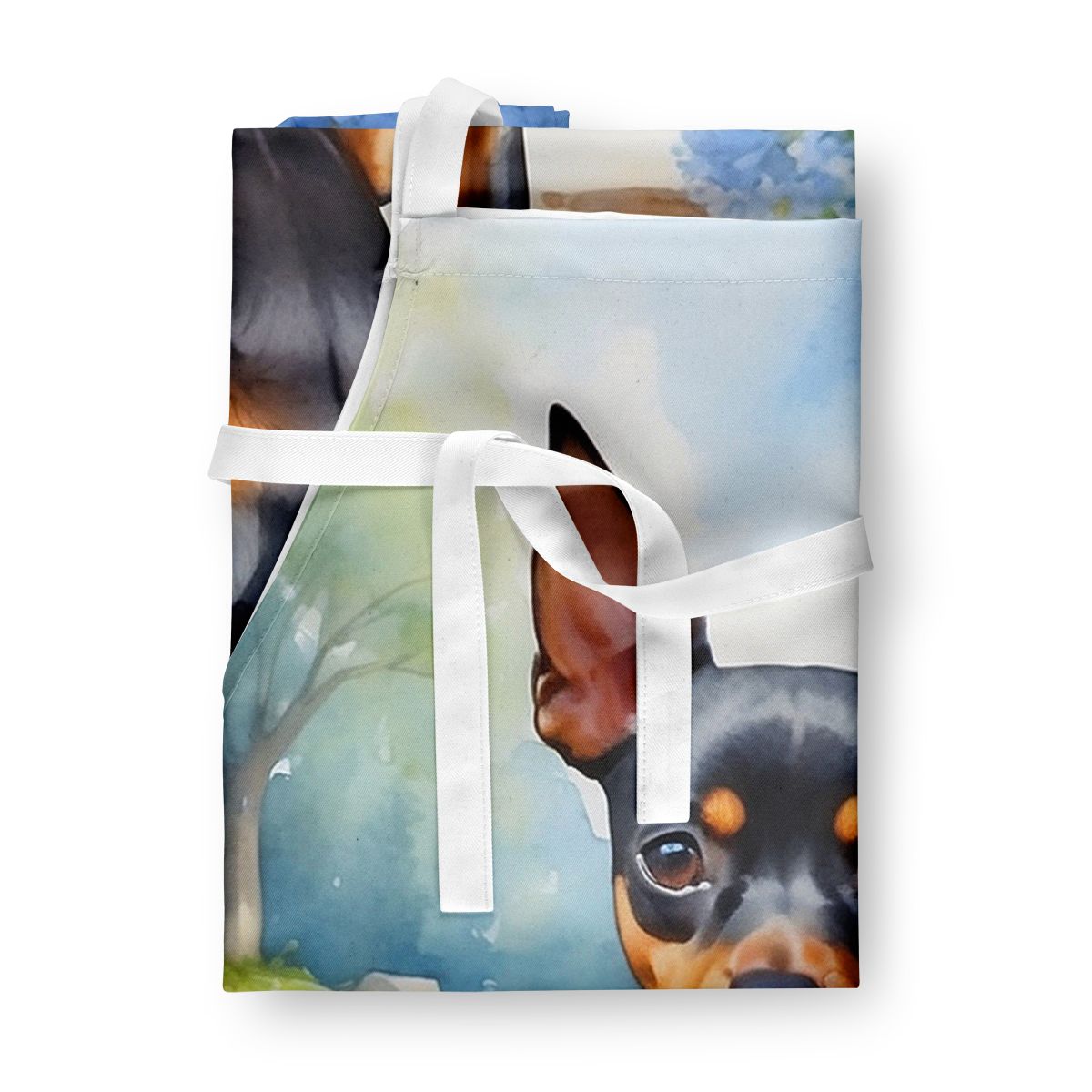 Apron featuring breed specific Miniature Pinscher artwork. Elevate your cooking, baking, and grilling experiences with our versatile Kitchen or BBQ Apron. This Bib Style apron isn't just limited to culinary activities - it also serves as an excellent baking apron, artist apron, server apron, gardening apron, or even a dog grooming apron. The apron showcases vibrant full-color artwork contributed by one of our talented artists, bringing a dash of style to your daily tasks. With dimensions of approximately 27"W x 30"H, it provides ample coverage to protect your clothing from spills and splashes. Our apron is meticulously crafted from 100% Ultra Spun Polyester, known for its durability and lightweight nature. The apron comes with white tie straps, ensuring a comfortable and adjustable fit for all. It's a perfect choice for kitchen apron enthusiasts, whether you are a woman or a man. Designed for easy maintenance, this apron is fully machine washable. The quick-drying polyester material actively reduces staining, keeping your apron looking fresh and new for longer. Our beautifully designed apron isn't just a functional kitchen accessory - it's a fashion statement in the culinary world!