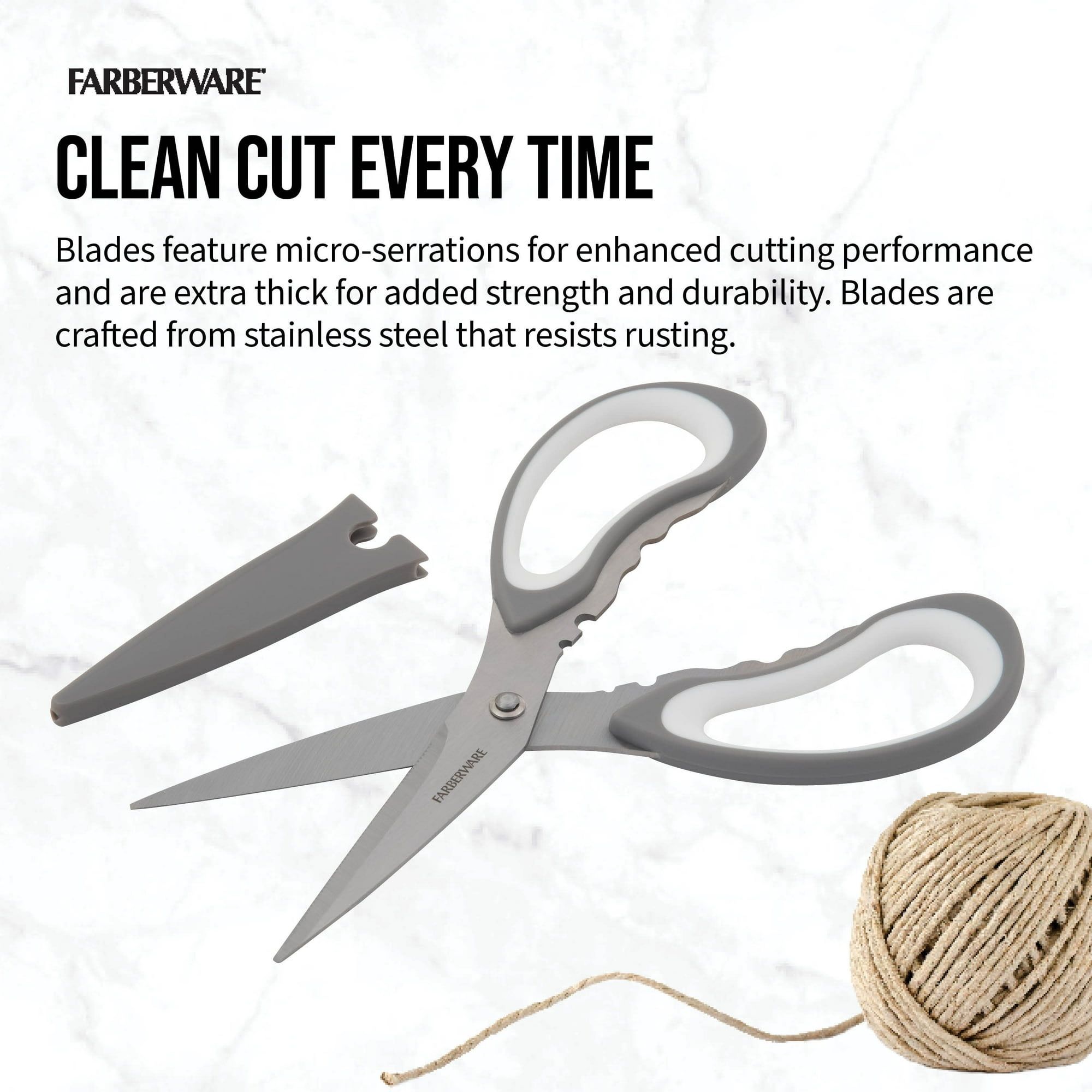 The All-Purpose Scissors with gray soft-grip handles are perfect for cutting meat, vegetables, twine, and more. These scissors feature ultra-sharp stainless steel blades that will retain an extremely sharp edge, with micro-serrations that provide a precise, clean cut. They also feature a built-in herb stripper and a bottle and jar opener. The extra thick, rust-resistant stainless steel blades stand up to daily use, while the ergonomically designed handles feature a soft grip for comfort in the hand while using. These essential shears with gray handles come with a protective blade cover to ensure safe, secure storage in drawers. Hand wash with warm water and a mild detergent; rinse and dry immediately.