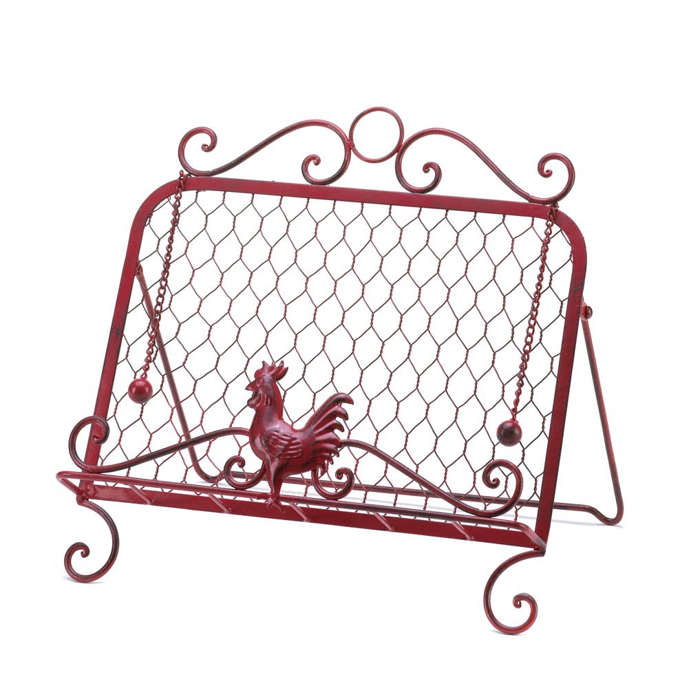 • This handy helper will keep your recipe book just where you need it as you put together a scrumptious meal. The decorative metal framework is highlighted by the country rooster at top and features two "page keeper" chains. It's also a great perch for your tablet. Works with most books and even tablets!